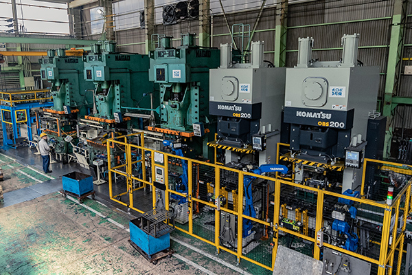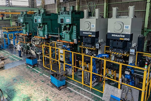 200~300㌧のプレス機を活用して難加工鋼材に対応しています。プレスの台数を増やすことで、5工程で加工を進めています。