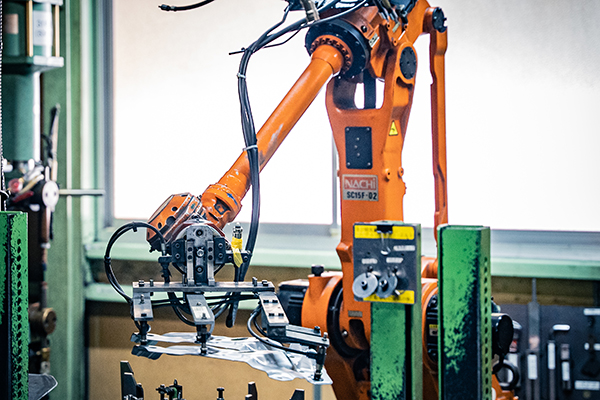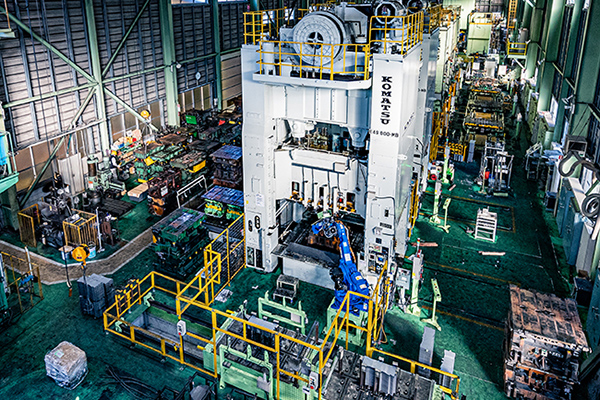 八城グループでは、最大800㌧の加圧能力のプレス機を先頭に置いた6工程ラインと、600㌧を先頭に置いた6工程ラインなどがあります。重い製品もありますが、6軸のプレス間搬送ロボットを用い、作業者の負担軽減と生産効率向上を念頭に生産を行っています。
